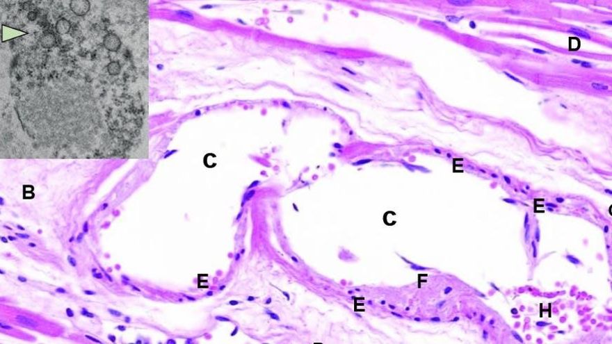 En esta imagen se muestra microscopía electrónica de transmisión (A), y microscopía óptica, tinción H&E, de corte histológico de músculo cardíaco (B-H), en paciente con Covid-19 fallecido por infarto de miocardio. El corte procede del músculo cardíaco conservado, no afectado por el infarto. A: detalle de porción citoplásmica de célula endotelial cargada de virus. Los agregados de partículas virales (flecha), se muestran como círculos densos con centro claro. B: estroma conectivo laxo edematoso de músculo cardíaco, con vaso sanguíneo dilatado (C). D: células musculares cardíacas conservadas (cardiomiocitos). E: células endoteliales reactivas que tapizan el vaso, con restos de fibrina adheridos (F), y algunos linfocitos dispersos bajo el endotelio (G). H: hematíes dentro de la luz del vaso. El grado de endotelitis es mínimo, casi imperceptible en microscopía óptica.