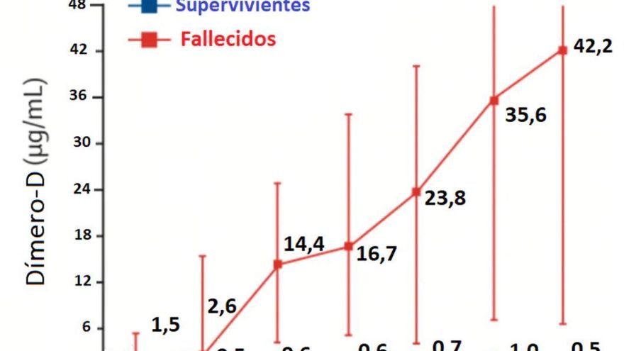 Los investigadores chinos ya habían publicado el 9 de marzo la relación entre el dímero-D y la gravedad de la COVID-19. En la Figura 2 puede comprobarse cómo, a medida que transcurren los días, en los pacientes que van a fallecer va aumentando el riesgo de formación de trombos, cuyo indicador es el incremento en los niveles de dímero-D.