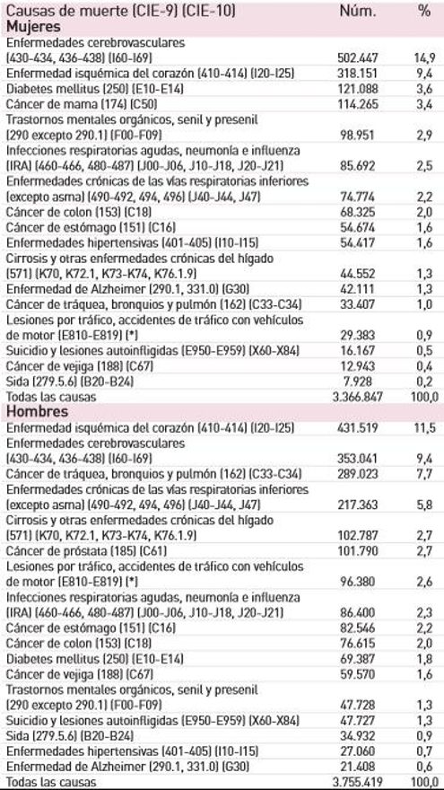 El atlas, editado por la Fundación BBVA, muestra que las enfermedades cerebrovasculares, como el infarto cerebral, son la primera causa de mortalidad en mujeres, con el 14,9% de los casos. Unas 500.000 mujeres murieron por esta razón entre 1984 y 2004. La mayor mortalidad aparece en la mitad sur: Extremadura, Andalucía, Murcia, Valencia y el sur de Castilla-La Mancha. La enfermedad isquémica del corazón, segunda causa de muerte de las mujeres, con el 9,4% de los casos, también se acumula en el sur: centro de Extremadura, Cádiz, Sevilla, Huelva, Murcia, la costa de Valencia y las islas Canarias.