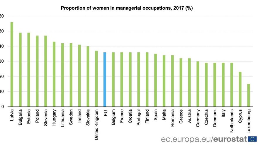 La mayor proporción de mujeres entre los puestos directivos se registra en Letonia (56%), el único Estado miembro donde las mujeres son mayoría (56%) en esta ocupación. Le siguen Bulgaria y Estonia (ambos 49%), Polonia. y Eslovenia (ambos 47%), Hungría (43%), Lituania y Suecia (ambos 42%), Irlanda (41%) y Eslovaquia (40%).