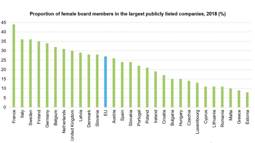 La mayor proporción de mujeres en el consejo de administración de las mayores empresas que cotizan en bolsa se registra en Francia (44%), seguido por Italia y Suecia (ambos 36%), Finlandia (35%) y Alemania (34%).