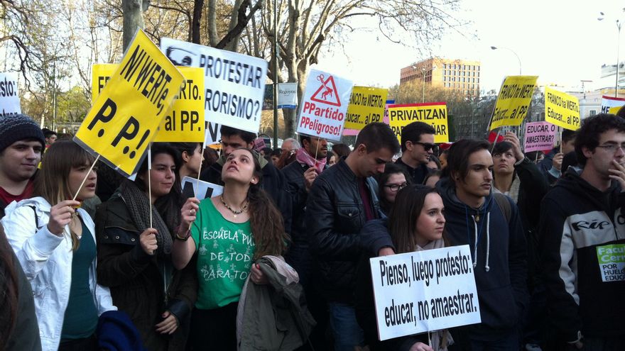 A los alumnos que ya protestaban desde la mañana se han sumado esta tarde cientos de padres y docentes que, aunque no han secundado la huelga, sí han querido apoyar las reinvindicaciones estudiantiles. La subida de tasas, el recorte en las becas y la implantación de la LOMCE son las tres patas de un conflicto que se recrudece con cada nueva decisión del Gobierno.