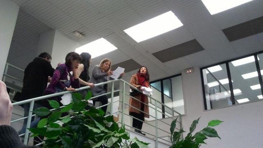 Esta mujer está, precisamente, en paro, y la oficina en la que ha alzado su voz es la misma donde va a fichar su tarjeta, donde va en busca de ofertas de empleo en su sector, que es el del teatro, o de cursos de formación, de los que afirma ya no haber nada. Otra mujer ha venido provista con dos termos de café con leche, del que va repartiendo tazas calientes a las personas que esperan. Nadie dice que no, salvo los policías, con quien también lo intentan. Cuando termina la lectura del manifiesto se convoca a una Asamblea en Sol el domingo 10 de febrero. Uno de los vigilantes se acerca a la portavoz y le advierte que no se apoye mucho en la escalera, que se puede caer. Ella aprovecha el gesto del vigilante para llevarle a su terreno: “gracias -le dice- por cuidar de nosotros”. El empleado de seguridad se lleva un tímido aplauso. Un cargo de la oficina se acerca a los ocupantes: “estoy de vuestro lado, pero no me hagáis pasar por el mal trago de pediros que os vayáis”. Lo entienden, le agradecen y con tranquilidad se desaloja la oficina.