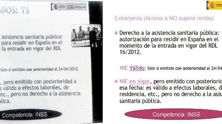 “Las primeras diapositivas, dividen a los NIE (número de identidad de extranjero) como válidos en función de la fecha de publicación del real decreto de una manera muy confusa”, critica Meseguer. En la presentación se recogía que un NIE en vigor, pero posterior al 24 de abril de 2012, “es válido a efectos laborales, de residencia, etc., pero no da derecho a la asistencia sanitaria pública”.