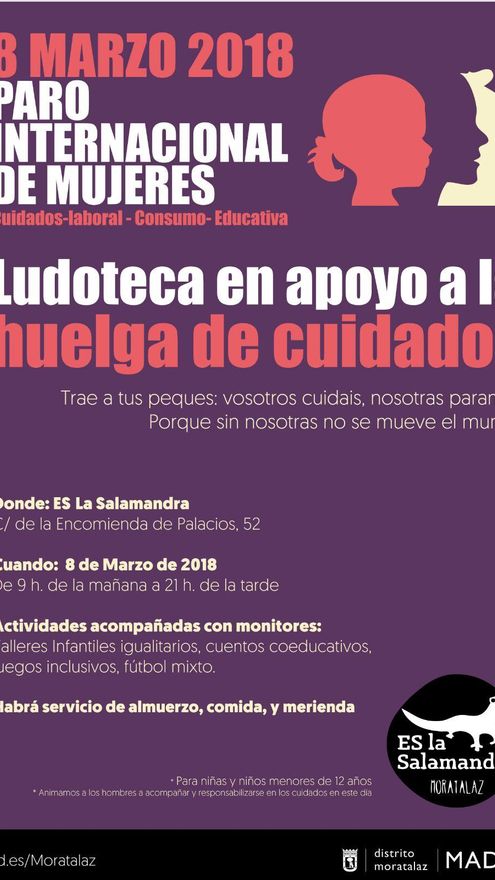 La Salamandra ya ha comenzado a difundir por el barrio la iniciativa, que denominan “Ludoteca en apoyo a la huelga de cuidados” y que cubrirá un horario de 9.00 a 21.00 horas. Servirán almuerzo, comida y merienda y dedicarán el día “a diversas actividades que van desde talleres infantiles igualitarios a cuentos coeducativos, con perspectiva de género, o fútbol y otros juegos mixtos”, explica Carlos, que señala que el Ayuntamiento de Madrid apoya la iniciativa a través de la Junta de Distrito de Moratalaz, que pone a disposición del espacio algunos profesionales.