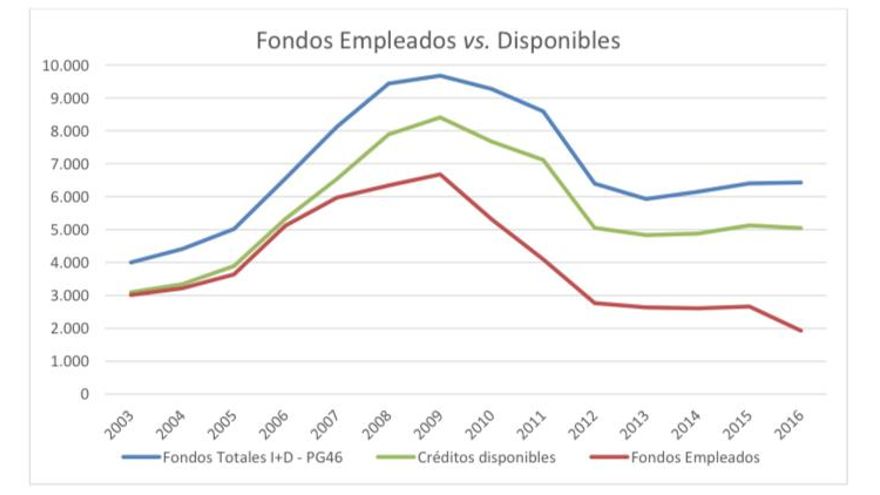 Los datos publicados por la COSCE indican que se han dejado sin gastar unos 3.155 de los 5.797 millones de euros destinados a I+D, lo que supone que tan solo se ha invertido el 38% de los fondos programados, una caída muy significativa con respecto al año anterior, en el que se gastó casi el 52% del presupuesto. Este porcentaje de gasto no ha hecho más que disminuir en los últimos años, ya que en 2011 se ejecutó más de 57% del total presupuestado.