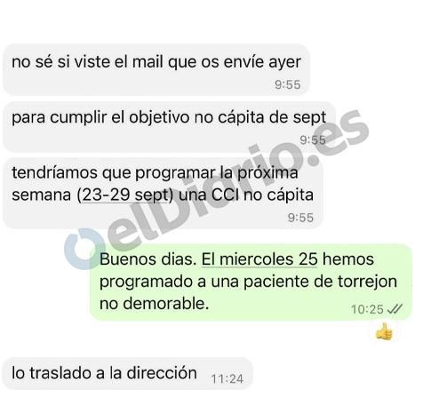 Mensajes del departamento de admisión del Hospital de Torrejón en los que pide al servicio de cirugía cardiaca del centro programar una intervención para cumplir el cupo de pacientes "no cápita".
