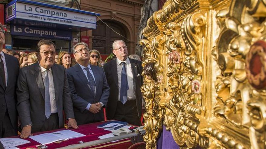 También le acompañaba el ministro de Justicia, Rafael Catalá (otro de los que más se han prodigado en procesiones), el presidente de la Diputación de Málaga, Elías Bendodo, y el alcalde de Málaga, Francisco de la Torre. Los dos ministros besaron la medalla de la cofradía momentos antes de que el tercer trono de la procesión abandonara la iglesia en la que se encontraban.