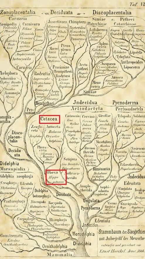 Miren en el árbol filogenético dibujado por Haeckel (Figura 1) y verán que no situó a los hipopótamos (Obesa, Hippopotamus) dentro de los artiodáctilos, sino en un minúsculo ramal del tronco que conduce a Cetacea, dentro del cual colocó a ballenas (Balaena), cachalotes (Physeter) y delfines (Delphinus).
