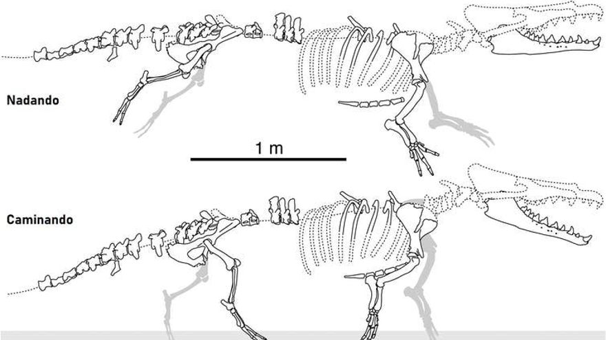 Cuando se montó el esqueleto (Figura 2), los apéndices transversales bifurcados y expandidos de los grandes huesos de la cola resultaron ser similares a los de castores y nutrias, lo que sugiere una contribución significativa de la cola durante la natación.