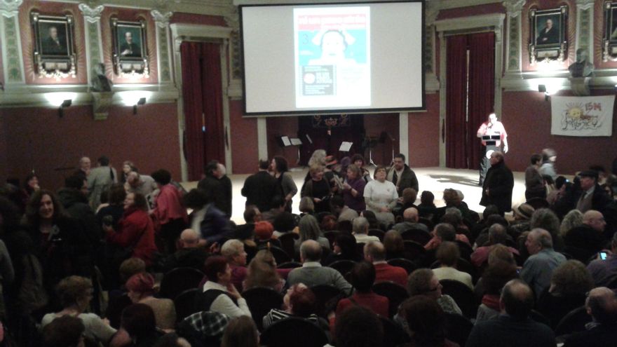 “Perdonad que estemos algo apretados, pero habrá ocasiones para estar más cómodos”, pedía una de las presentadoras desde el atril al comprobar el aforo más que completo y algunas protestas por parte del público. “Es únicamente la presentación”. La convocatoria ha partido de la Mesa por la Defensa de la Sanidad Pública de Madrid, un colectivo que agrupa a docenas de organizaciones vecinales, movimientos sociales, organizaciones sindicales, de usuarios, profesionales sanitarios, plataformas y el 15M. Se trata de un primer movimiento de rechazo antes de que los 50 magistrados de lo contencioso-administrativo de Madrid decidan los próximos 9 y 10 de enero sobre la adjudicación de la gestión de seis hospitales públicos a tres contratistas privados.