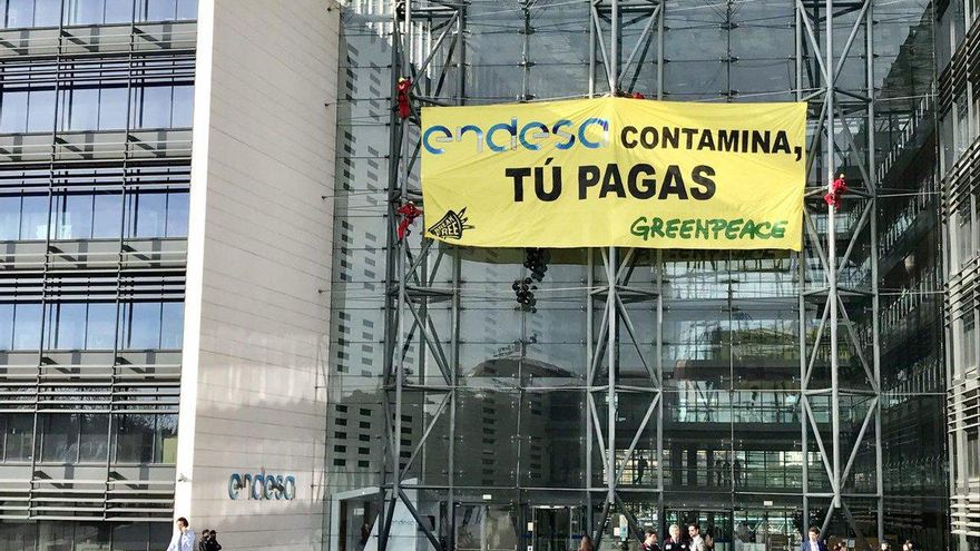 45 minutos después de iniciar la acción en la capital, los escaladores estaban ya colgados en mitad de la pared exterior al tiempo que comenzaban a llegar unidades de la Policía Nacional. Al pie de la escalada, una pancarta repetía: “Endesa contamina, tú pagas”. En la altura, el cartel amarillo repetía el lema.