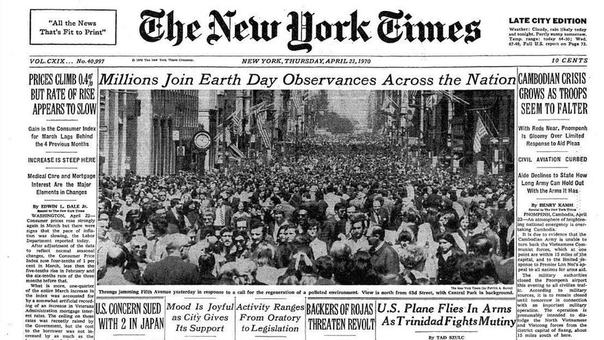 El 22 de abril de 1970, 20 millones de personas tomaron las calles en ciudades y pueblos de EE UU. Liderados por el senador Gaylord Nelson y coordinados por el estudiante de 25 años del Harvard Kennedy School, Denis Hayes, cerca de 2.000 comunidades de todo el país secundaron manifestaciones —que llegaron a cerrar la Quinta Avenida de Nueva York—, asistieron a charlas y participaron en “limpiezas”. Sus voces se alzaron por una preocupación emergente: el impacto de la humanidad sobre el planeta.