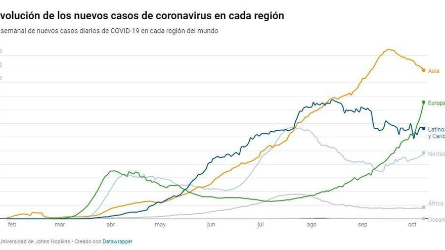 La curva de casos de coronavirus en el continente europeo sigue ascendiendo a una velocidad vertiginosa. La media semanal de nuevos contagios se sitúa hoy en los 85.700 casos. Desde que el pasado 2 de octubre los nuevos casos en Europa superaran a los de Latinoamérica, el viejo continente es la segunda región del mundo más afectada por el virus SARS-CoV-2.