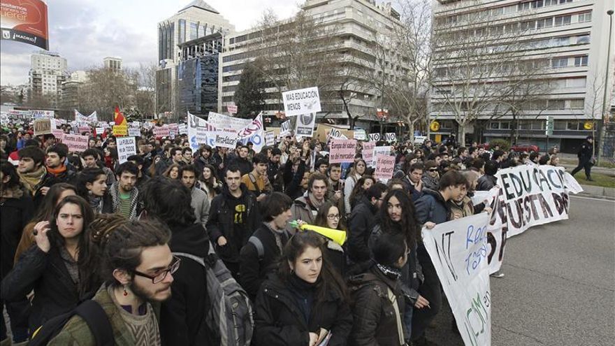 A las 6 de la tarde se ha unido toda la comunidad universitaria madrileña en una manifestación bajo el emblema “la educacion no pagará vuestra deuda”. La manifestacion, que cuenta con el apoyo de los sindicatos CCOO y UGT, ha sido convocada para “exigir la retirada de la reforma educativa y la dimisión del ministro de educación José Ignacio Wert”. Desde Nuevos Ministerios hasta el Ministerio de Educación, la manifestación ha sido secundada por miles de estudiantes de las universidades públicas de Madrid. Según aseguran los manifestantes, “esta movilización en defensa de la educación pública, no será la última”.