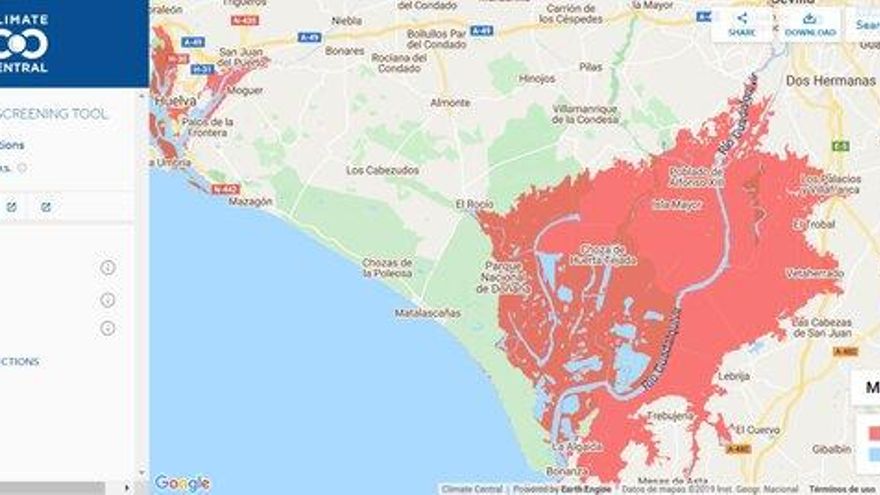 Otro estudio reciente, publicado en la revista Nature Communications, mostraba otra aplicación, en este caso sobre la proyección de subida del nivel del mar en todo el mundo para 2100. Según sus estimaciones, el área de Doñana y toda la desembocadura del Guadalquivir podrían inundarse por completo debido a la crisis climática.