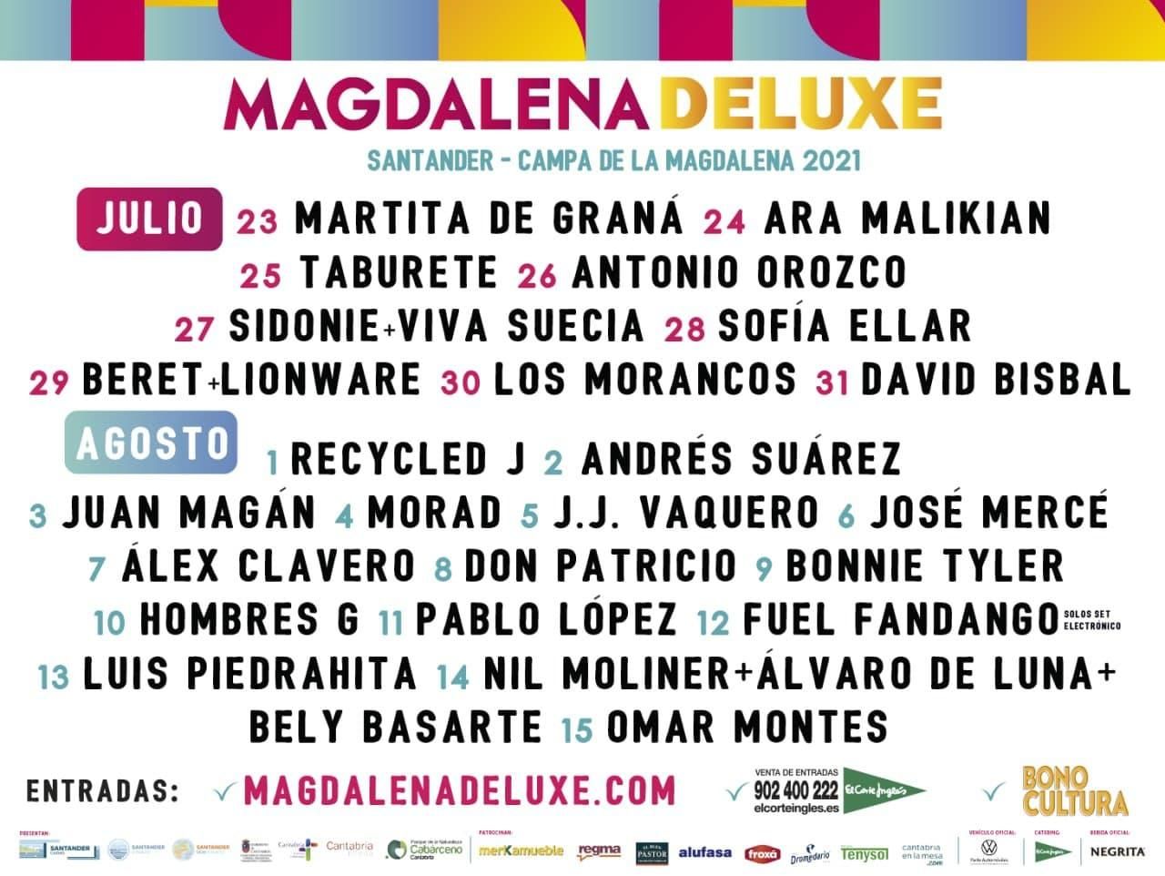 Magdalena Deluxe Santander ha organizado un festival muy especial compuesto por 24 noches consecutivas de conciertos y espectáculos pensados para todos los públicos. Contará este verano con grupos y artistas como David Bisbal, Andrés Suárez, Juan Magán, José Mercé, Bonnie Tyler, Hombres G, Pablo López o Fuel Fandango, además de humoristas y cómicos como J.J. Vaquero, Álex Clavero o Luis Piedrahita, en un entorno único junto a la playa como es la campa de La Magdalena.