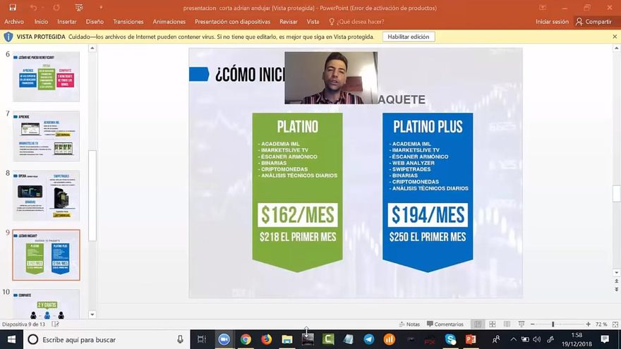 En la última parte del vídeo, Andújar explica cómo ganar dinero a través de IMarketsLive. Siempre hace referencia a “las herramientas”, pero recalca que los resultados dependen de uno mismo. Para acceder al contenido que otorgará a los usuarios los conocimientos necesarios para invertir en Forex, estos tienen que pagar una cuota mensual para mantener activa su cuenta. Una parte de esas lecciones que ofrecen se pueden encontrar viendo este vídeo durante más de dos minutos en YouTube. Hay dos paquetes: Platino y Platino Plus, aunque Andújar solo hace referencia al primero. La cuota es de 218 dólares (193 euros) el primer mes y 162 dólares (143 euros) los siguientes.
