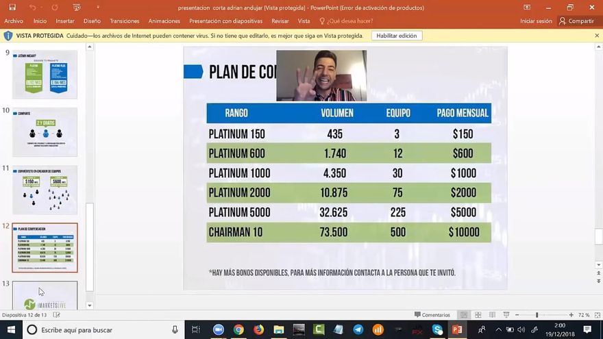 Sin embargo, Andújar menciona que esta cuota puede ser gratuita en el momento en el que el usuario traiga a dos personas, que siempre tienen que estar activas. Y aún se pone mejor la cosa: “Con dos te sale gratis, pero es que con tres personas tú cobras 150 dólares [132 euros]”, dice el streamer. Esta es la otra forma de ganar dinero que propone la empresa: traer a gente que recomiende a otra gente y formar equipos cada vez más grandes. Según la diapositiva de Andújar, con 30 personas el usuario estaría cobrando 1.000 dólares al mes (885 euros), con 75 ganaría 2.000 dólares (1.770 euros) y en el rango superior, llamado Chairman 10 y que necesita a 500 personas, se cobrarían 10.000 dólares mensuales (8.849 euros). “Hay dos opciones de ganar dinero, el trading y el network marketing, esto es haciendo equipo”, dice el presentador.