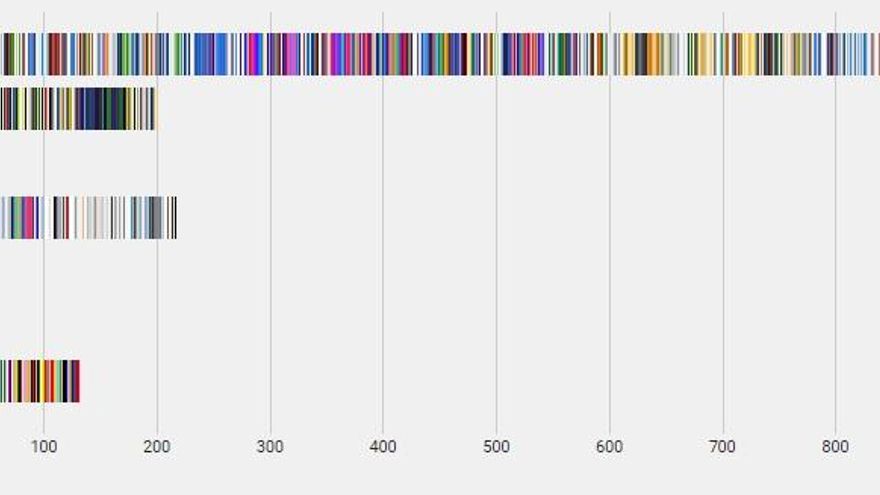 También ha agrupado a los colores por formato. Esto es la forma de la que están codificados. Pueden ser hexadecimales, hexadecimales de tres dígitos, RGB, RGBA, HSL, HSLA o predefinidos. Gracias a este análisis ha descubierto que la mayoría están codificados en hexadecimal.