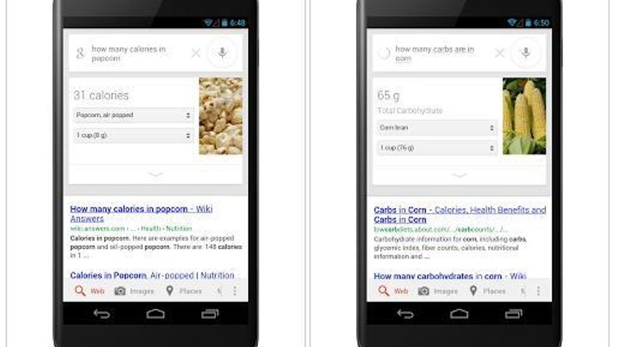 Un usuario puede preguntar a Google (en inglés, de momento) ‘cuántas calorías tienen las palomitas’ y el buscador le devolverá el dato concreto, así como una ficha técnica sobre el alimento, acompañada de una imagen. La información se saca de diferentes fuentes, que aparecen enlazadas debajo de las tablas. Aparte de esto se ofrecen los resultados habituales para la consulta en cuestión.