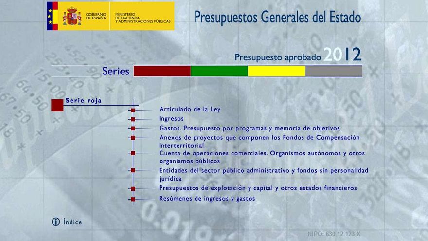 La URL que acortaba entonces era la del Proyecto de Presupuestos: http://www.sepg.pap.minhap.gob.es/sitios/sgpg/es-ES/Presupuestos/ProyectoPGE/Paginas/ProyectoPGE2012.aspx, que a día de hoy muestra un error 404 de página no encontrada. No ayuda mucho a la transparencia eliminar cosas tan importantes de Internet; tampoco ayuda al SEO de la web del Ministerio, aunque seguro que no es lo prioritario en estos años. Una vez más toca tirar de Google para consultarlos en la página pertinente: http://www.sepg.pap.minhap.gob.es/Presup/PGE2012Ley/MaestroDocumentos/PGE-ROM/MnSerieRoja.htm