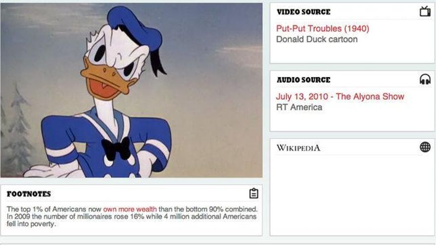 Uno de los ejemplos de aplicación de popcorn.js más conocidos es este experimento de Jonathan Mcintosh, en el que remezcla numerosos vídeos del pato Donald para mostrar a un perdedor que es despedido de su trabajo y sin mucho dinero con el que salir adelante. No lo ha redibujado y reanimado, simplemente ha remezclado trozos existentes de la serie original de Walt Disney; y con popcorn.js lo explica alrededor del vídeo tal y como se va reproduciendo.