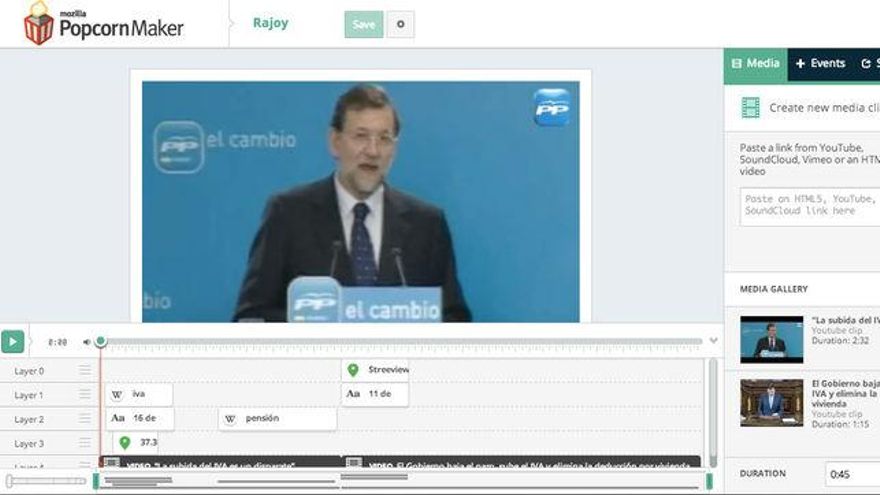 Popcorn Maker ofrece dos importantes avances en el mundo del vídeo en Internet. La primera atiende a la posibilidad de enriquecer algo ya hecho por alguien, esto es, utilizar un vídeo de YouTube, Vimeo, etc. para añadirle elementos, sin tener que bajar el vídeo, pasarlo por el Final Cut o el Premiere y subirlo de nuevo a nuestra cuenta. Todo queda donde está y lo que hace Popcorn Maker es añadir la capa de información que queramos. Y por otro lado, podemos añadir el contexto que muchos vídeos necesitan dentro del propio vídeo, ofreciendo unas posibilidades nuevas a los medios de comunicación.