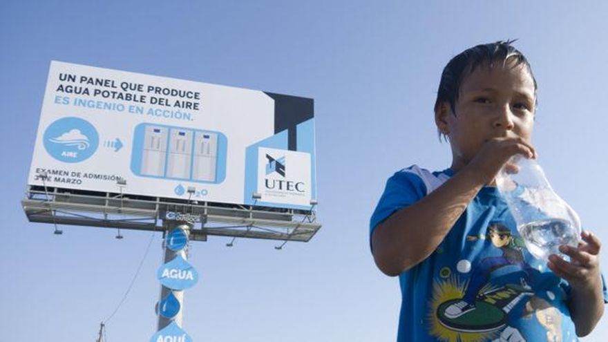 Bujama está plantada en un desierto y casi no conoce la lluvia, pero disfruta de un grado de humedad de hasta el 98%. Los habitantes de esta austera localidad peruana conseguían agua de pozos que a veces estaban secos y a menudo contaminados hasta que la recién estrenada Universidad de Ingeniería y Tecnología de Perú plantó un anuncio publicitario sin precedentes: un banner que recoge y procesa la humedad del aire para convertirse en una fuente de agua potable.