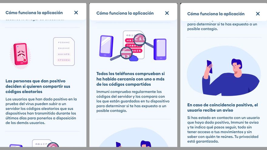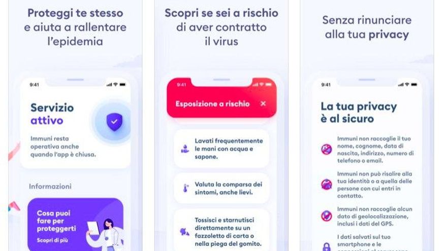 “Immuni vincula un código aleatorio a cada teléfono. El código se genera de forma aleatoria y no contiene información sobre tu dispositivo y, por supuesto, tampoco sobre ti. Además, cambia varias veces cada hora para garantizar la máxima protección de tu privacidad”, informa la aplicación, desarrollada por la empresa italiana Bending Spoons: “Los teléfonos que se detectan entre sí intercambian sus códigos aleatorios. Cuando estás cerca de otro usuario con Immuni, los dispositivos se intercambian sus códigos a través de Bluetooth Low Energy. De este modo, la aplicación lleva un seguimiento de los contactos, pero no tiene acceso a la identidad de los usuarios ni al lugar de encuentro”.