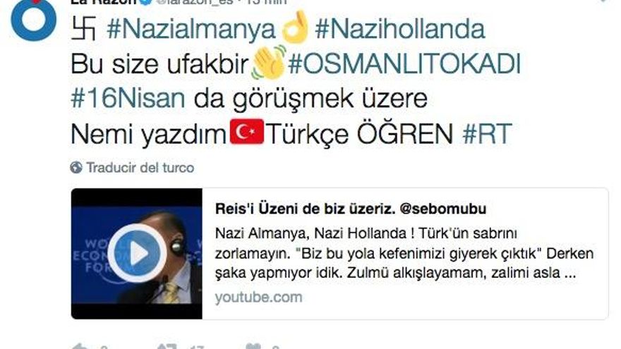 “Esto es una bofetada de parte de los otomanos. Nos vemos el 16 de abril. Aprende lengua turca”. Ese día, en Turquía hay convocado un referéndum que introducirá enmiendas a la constitución turca. A los tuits también les acompañan varias esvásticas y un vídeo en YouTube con imágenes de Erdogan y consignas a su favor.