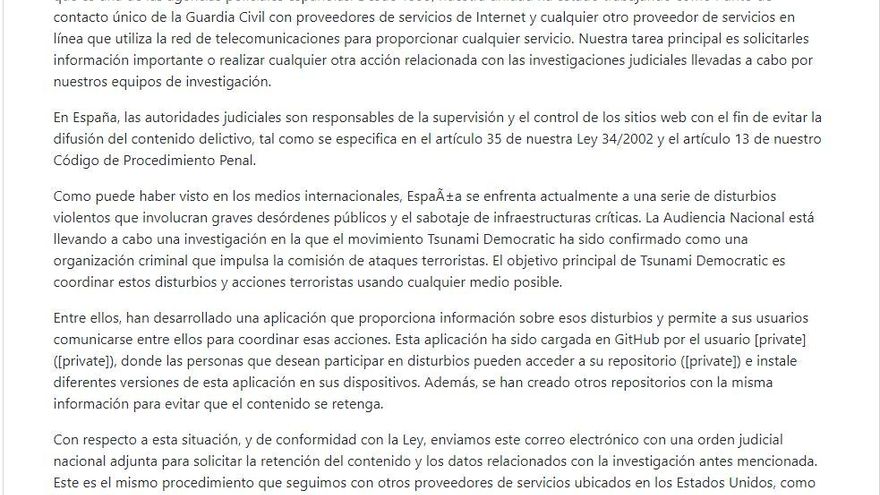 El Grupo de Interceptación de las Telecomunicaciones de la Guardia Civil se ha puesto en contacto con GitHub a través de una carta escrita en inglés y español, en la que solicita el bloqueo del repositorio de Tsunami Democràtic porque, asegura, se trata de “una organización criminal”.