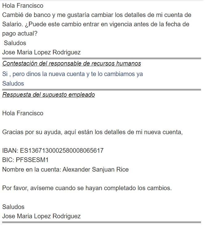 Con la información obtenida del empleado, los atacantes suplantan su identidad y se ponen en contacto con Recursos Humanos por correo electrónico. En un tono amigable, preguntan si sería posible cambiar el número de cuenta en el que hasta ahora se recibe la nómina por uno nuevo, controlada por ellos, con la excusa de que ha cambiado de banco.