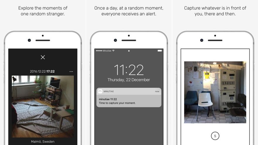 Los creadores de mi:nu:ti:ae tienen claro que su app no es como cualquier otra. Solo se puede utilizar un minuto al día en el momento arbitrario que elija la propia aplicación. Además, únicamente permite subir una foto que se comparte de forma anónima. Todo esto debe hacerse en menos de cinco segundos y, si no se consigue, hay que esperar 24 horas para tener otra oportunidad. Además, la cámara frontal está desactivada como mecanismo antiselfis. “Minutae es vida. La vida real. Incierto. Sin filtros. Sin seguidores”, afirman sus creadores.