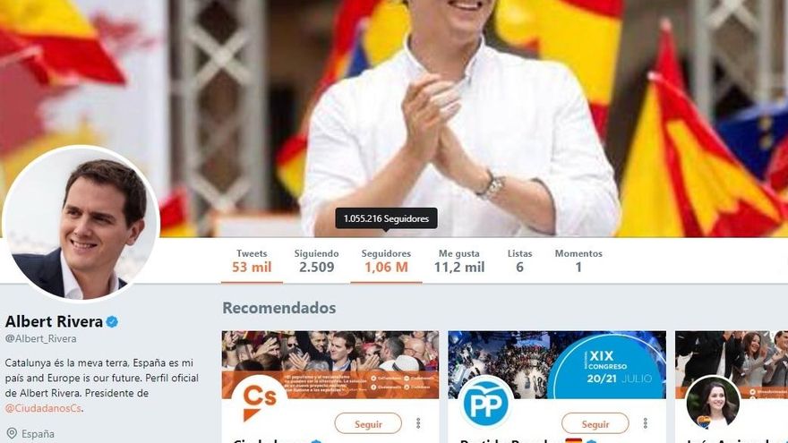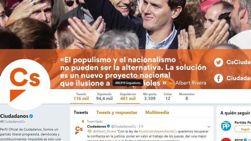 En Ciudadanos, la caída de seguidores es menos pronunciada. El jueves por la mañana, el perfil de Twitter rozaba los 481.000 seguidores, mientras que a última hora de la tarde ya habían bajado unos 7.000, lo que equivale a un 1,5% menos. Mientras se escribe este artículo, el partido de Albert Rivera suma 473.500 seguidores.