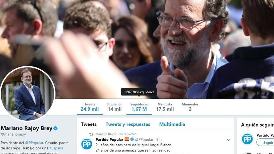 Le sigue Mariano Rajoy, expresidente del Gobierno y ahora registrador de la propiedad en Santa Pola. Antes de que Twitter omitiese las cuentas desactivadas, contaba con 1,67 millones de seguidores. Ahora tiene 1,62 millones, lo que supone 50.000 cuentas menos pendientes de sus tuits, un 3% menos.