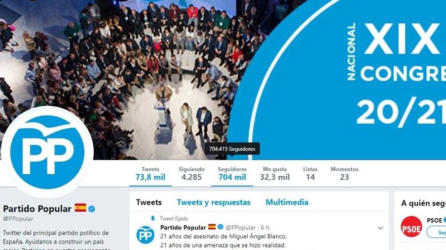 El Partido Popular tenía, antes de la limpieza de Twitter, 704.000 seguidores. Tras la omisión de cuentas inactivas se han quedado en algo más de 660.000. Es el segundo partido que más seguidores pierde. En total, 44.000 cuentas menos que ya no suman en el marcador de los populares; o lo que es lo mismo: un 6,25% menos de gente.