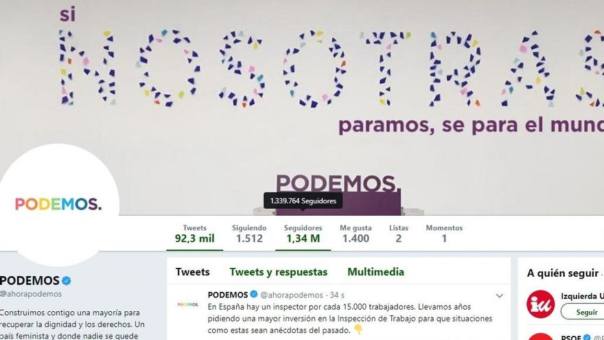 Podemos es el partido político español que más seguidores tiene en España y también es el que más ha perdido. Los de Pablo Iglesias contaban el jueves por la mañana 1,39 millones de followers, que tras el barrido de cuentas se han quedado en 1,30 millones. Una bajada de casi 90.000 seguidores, lo que equivale a un descenso del 6,5%.