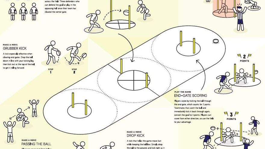 Estos son los principios básicos del juego, que se complementan con un puñado de reglas. Por ejemplo: un jugador no puede tener en su poder la bola más de tres segundos, los pases siempre tienen que empezar debajo de la cintura y se pueden dar hacia delante y hacia atrás. Para chutar a portería hay dos opciones: o bien dejando la bola caer al suelo y, tras su bote, disparar; o bien soltándola en línea recta con el pie y realizando el chut en ese instante.