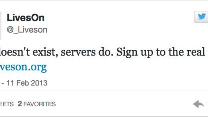 LivesOn ofrece, a diferencia de las anteriores aplicaciones, un servicio insólito: garantiza que tu cuenta personal de Twitter siga enviando tuits, marcando favoritos y retuiteando otros mensajes desde la tumba. Al más puro estilo de la serie británica Black Mirror, la aplicación lleva a cabo un análisis de los gustos, las preferencias y la forma de expresarse que se desprenden de la propia cuenta, cuando aún estamos vivos, para mimetizar al máximo nuestra personalidad tuitera.