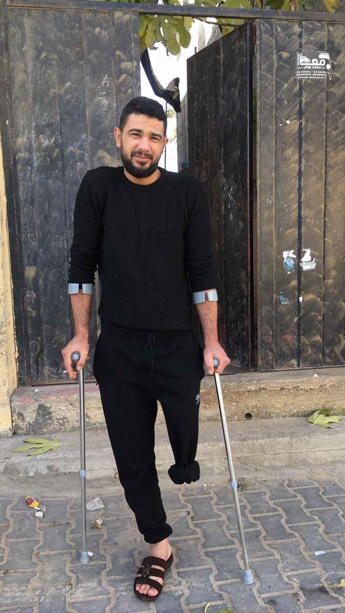 Los días que siguieron los recuerda borrosos por el dolor, los medicamentos y la rabia. Una misma bala atravesó su pierna derecha y después alcanzó la izquierda destrozándola por dentro. “No me amputaron la pierna desde el principio porque había una posibilidad pequeña de salvarla, pero tenía que ser trasladado fuera de Gaza porque aquí no había cómo realizar esa operación”, explica.