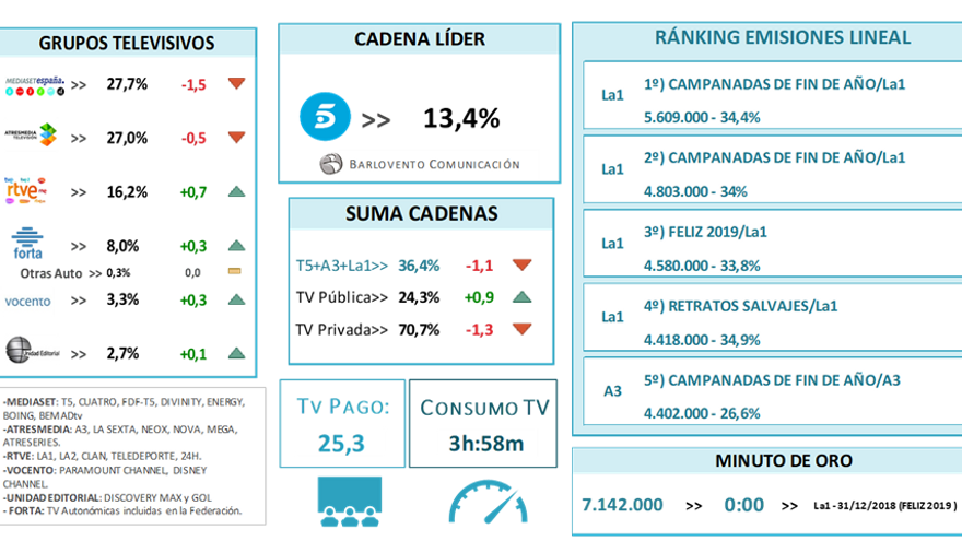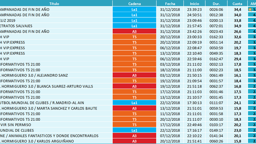 - La emisión más vista del mes corresponde a Campanadas fin de año (La 1-31/12/2018) con 5.609.000 audiencia media y 34,4% de cuota de pantalla.