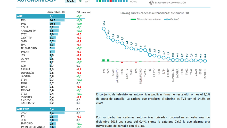 - El ránking de autonómicas por cuota de pantalla está encabezado por TV3 (14,2%), líder en su ámbito de emisión, aunque sube +0,9 puntos, seguida de TVG (10,4%), Canal Sur (9,2%), Aragón TV (8,6%) y ETB2 (7,9%).