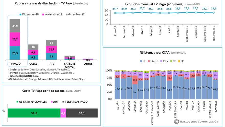 - El conjunto de la TV de Pago firma el 25,3% del total del consumo de la audiencia, sube 0,1 punto en relación al mes pasado.