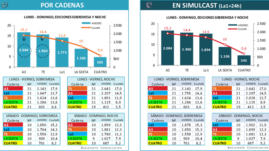 - En el concepto “simulcast” también es líder Antena 3, la cadena más vista en la ponderación de las dos ediciones.