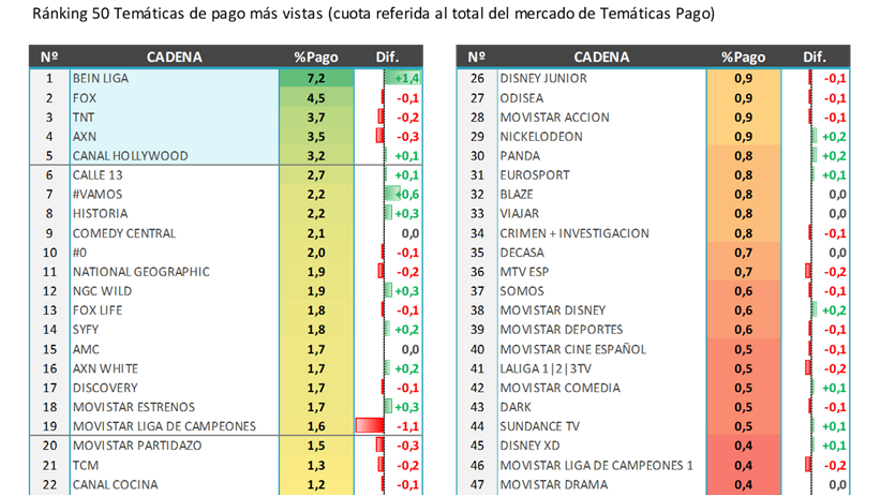 - Las cadenas que registran una mayor audiencia en este grupo son: BEIN LIGA, FOX, TNT, AXN, CANAL HOLLYWOOD, CALLE 13, #VAMOS, HISTORIA, COMEDY CENTRAL y #0.