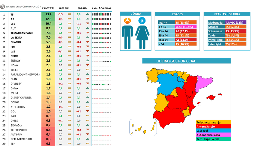 - Los liderazgos por targets se reparten de la siguiente manera: Telecinco: líder en mujeres , en los adultos jóvenes de 25 a 44 años y en los mayores de 64 años. Antena 3: Líder en hombres, en jóvenes de 13 a 24 años, en maduros de 45 a 64 años y en el “Target Comercial”. Clan: líder en niños de 4 a 12 años (13,4%).