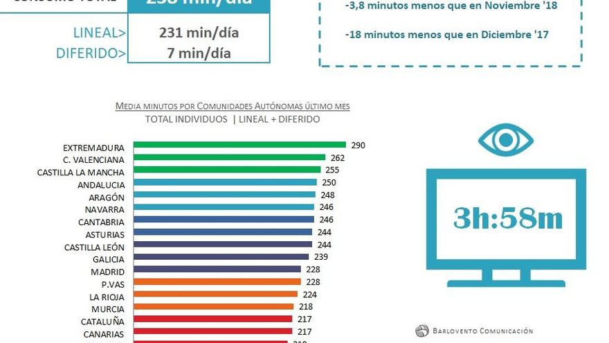 - El consumo totalizado de este mes es de 238 minutos por espectador y día→ -3,8 minutos menos que en Noviembre ’18 y -18 minutos menos que en Diciembre ’17. El mes de diciembre de menor consumo desde 2006.