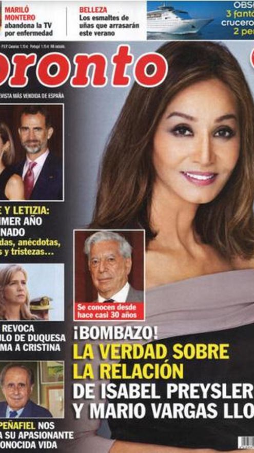 Isabel Preysler y su estrecha relación con el escritor Mario Vargas Llosa acaparan las portadas de las revistas del lunes. Además, Oriana Marzoli ('Supervivientes') y Liz Emiliano ('Gran Hermano') posan desnudas en Interviú tras su exitoso y polémico paso por un 'reality' chileno. También las palabras de Paz Padilla sobre su novio imputado, la “cita” entre Belén Esteban y su fiel torero de 'GH VIP'...