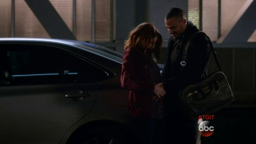 Cuando se lo hace saber a April, ésta no tarda en acercarse a Jackson y le coge la mano para que sienta las primeras patadas del bebé.